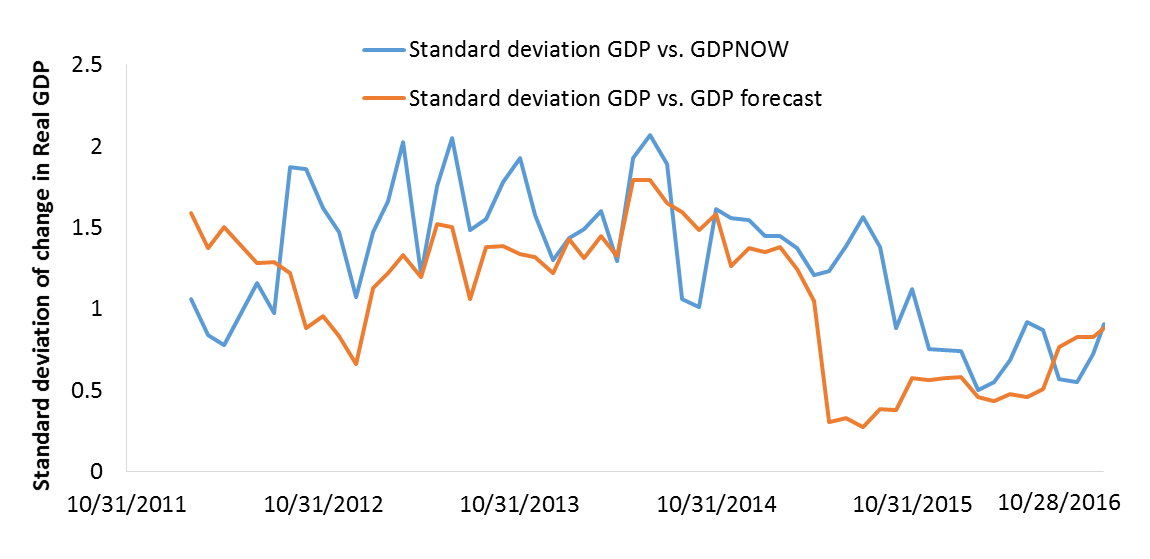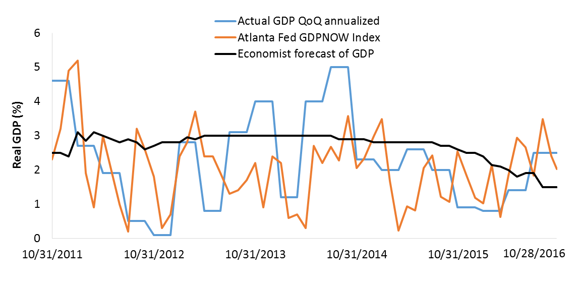 To analyze GDP, an economist would look at the sum of the parts. GDP is an accounting based measure of consumption, investment, government spending and net exports. Recent trends in the GDP components has seen robust consumer spending of 4%, gross private investment by an average of -8%, government spending subdued at -0.3% and net exports at 1.5%. The sum produces an anemic GDP growth of less than 1.5% annualized. Forecasts show consumption is to remain at brisk 4.6% and economists expect fiscal spending to pick up by +1% into 2017. Despite investment is expected to stay modest, it may not be such a drag into 2017.