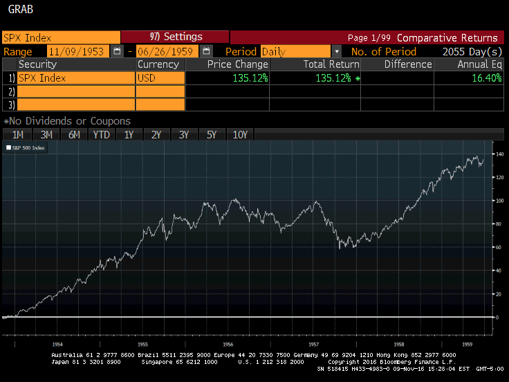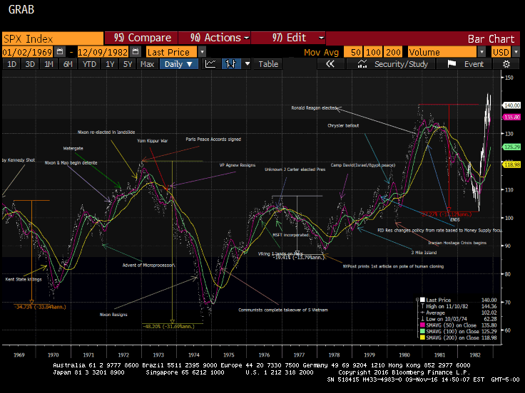 From the late 60's to the election of Ronald Reagan, the US stock market had a total return(1/69-11/80) of (-29%). The world was in complete disarray, much as it is today(or has been). Policies were turned upside down. Wars (Vietnam,Yom Kippur,Cold War) were all ongoing simultaneously.