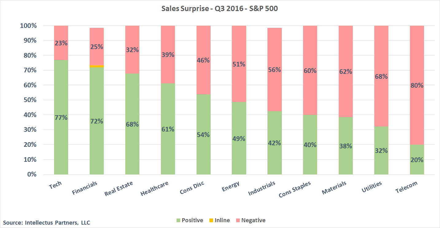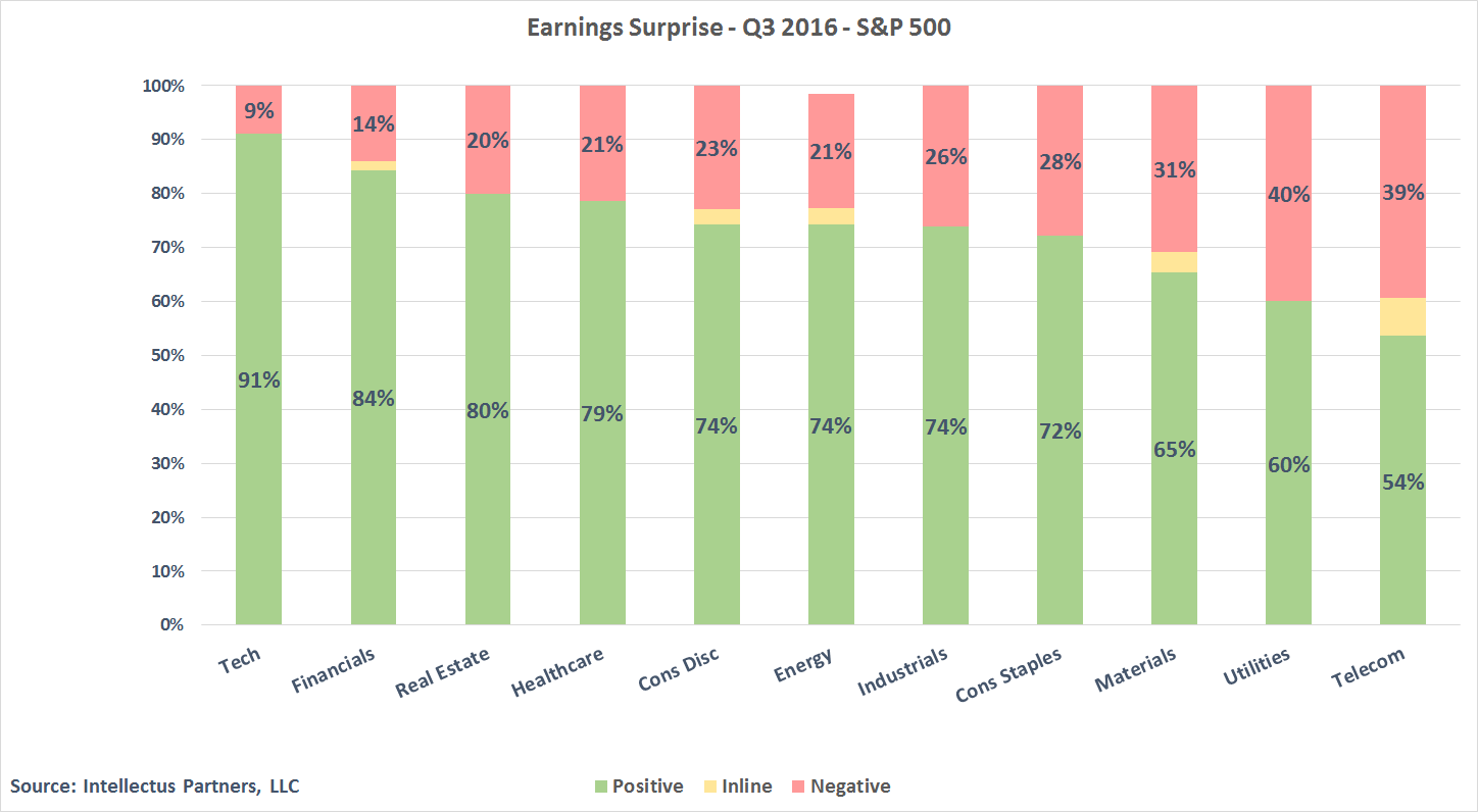 On the earnings side, the story was pretty similar, in that Technology & Financials were the leading sectors with ~ 90% of companies beating earnings estimates in those sectors. Real Estate & Telecom looked notably weaker on an earnings basis as nearly 40% of companies in those sectors missed earnings estimates.
