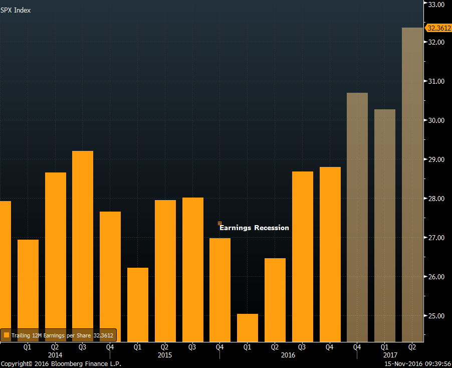 Looking at the bigger picture, the main question would be "Is the Earnings Recession behind us?" Looking at overall S&P 500 earnings over the past few years, you will notice that the S&P entered an earnings recession in late 2015 / early 2016. We seem to have pulled out of this trough for now, so the direction and trend is good. We don't put too much faith in the street estimates for EPS going forward, so we will be watching this closely, along with the high-frequency macro datapoints in order to give us a clearer signal for the medium-term market direction.