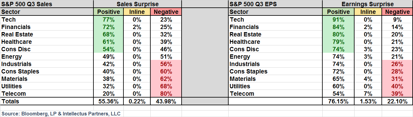 91% of S&P 500 companies have already reported, so at this point we have a pretty good indication of how things are going to settle out. Overall, the quarter was pretty impressive with 55% of companies beating Sales estimates and 76% of companies beating Earnings estimates. The standouts on both Sales and Earnings were Technology and Financials, with 91% of Tech companies beating Earnings estimates and 84% of Financials beating Earnings estimates. The laggards were Telecom Services and Materials on both Sales and Earnings. See below a table which ranks the sectors from best to worst on both Sales (left) and Earnings (right):