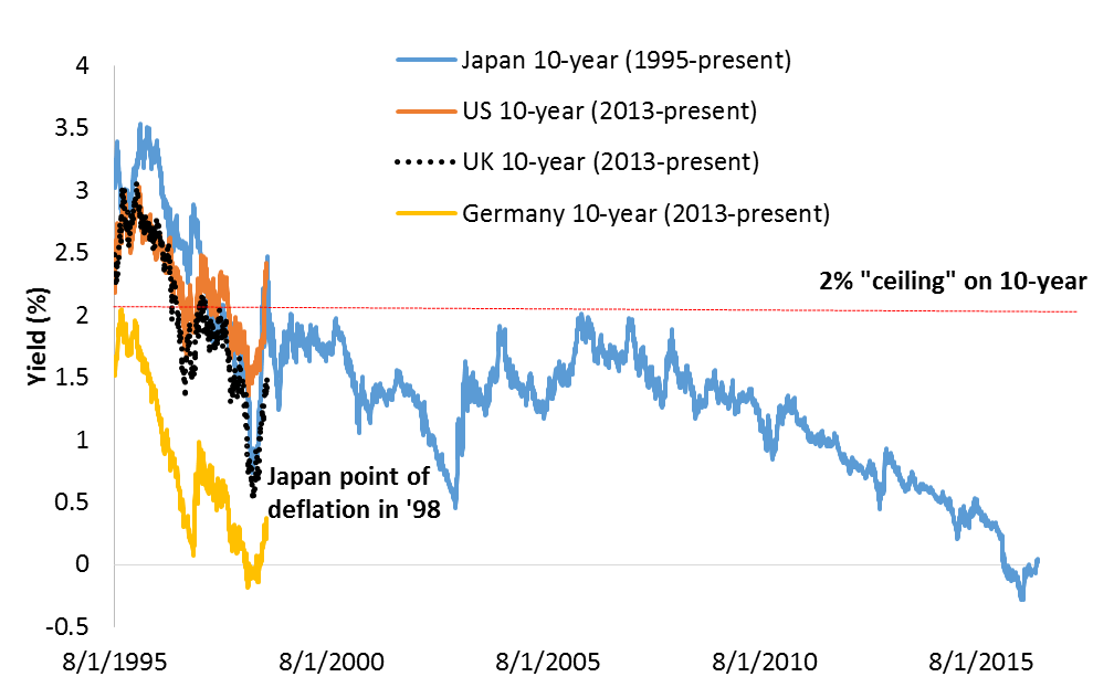 The effect of these secular forces was after an initial sharp fall, Japanese interest rates wandered below a “ceiling” of 2 percent as shown in Figure 2 on page 2. U.S., U.K. and German interest rates have in recent years followed an almost identical path as that of Japanese rates during late 1990s. This phenomenon has been dubbed “Japanification.” Interest rates react with occasional “overshoots” when stimulus is anticipated but fall right back below the 2 percent “ceiling” when stimulus fails to alter potential output.