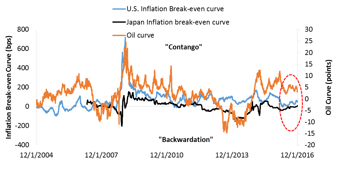 Source: Bloomberg, daily data, 2004-2016. Oil Curve = price of 13th oil futures contract (forward) – price of 1st oil futures contract (spot). Inflation break-even curve = 10-year break-even – 2-year break-even. In case of Japan, generic inflation swaps were used with history only back to 2007.