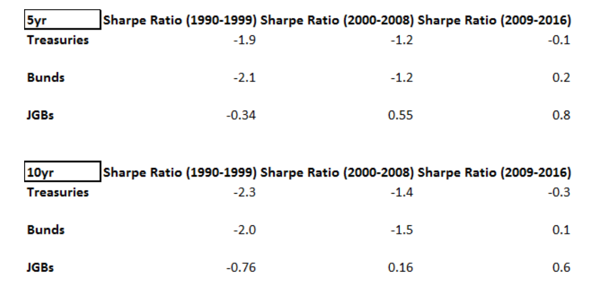2.Table 1 shows JGB Sharpe ratios became positive. Notable is how German Bunds and U.S. Treasuries’ Sharpe ratios are gradually turning positive in recent years.