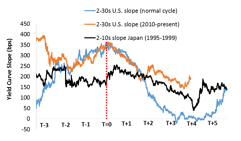 This relationship can be compared to Japan where the inflation break-even curve has been historically flat or inverted (black line, Figure 3). The U.S. break-even curve followed Japan with a flat term structure, which can imply inflation expectations remain below 2 percent target for a prolonged period.