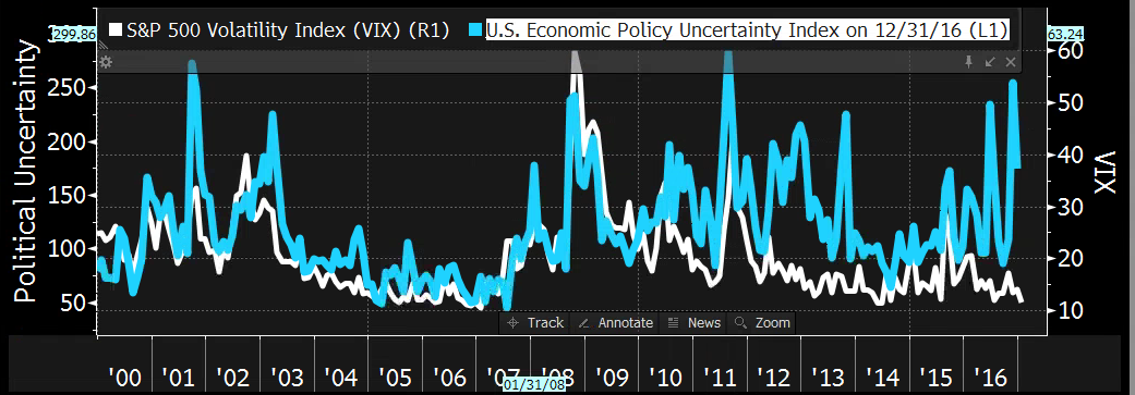Financial markets took the inauguration speech as a formal underlining of pro-growth and pro-business policy outlined during the campaign. Although many feel there remains uncertainty about the outlook for policy, markets have judged this differently. This can be seen from the divergence between the VIX index, a gauge of fear, and the policy uncertainty index, a measure of aggregate news related to politics. This is shown in Figure 1. The divergence between policy uncertainty and market fear has happened during 2012 and 2013, right before the U.S. economy experienced several quarters of over 4 percent growth. Hence interest rates “renormalized” to 2.5 percent and broader equity indices remain near record highs.