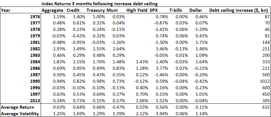In the past, debt ceilings have been generous to markets as well. In 2011, when the debt ceiling conflict caused S&P to downgrade of the U.S. Treasury debt, financial conditions tightened substantially. A debt ceiling limit or breach is the equivalent of a “technical” default in which the Treasury is unable to issue new debt or service existing debt. Fed researchers found that in a situation of a debt ceiling breach, Treasury Bills are specifically at risk and could cause a financial contagion if it becomes clear the government can’t fulfill near term obligations. This would be enough reason for markets to sell off sharply as they initially did during the debt ceiling impasse in 2011. A reason why markets rebound is that a last minute political resolve allows for government spending to resume and potentially expand to sectors that represent larger parts of the economy. When a debt ceiling becomes a crisis, developments can influence Fed policy that could result in monetary easing. This happened in 2011 when the Fed undertook "operation Twist" after the debt ceiling standoff ended.