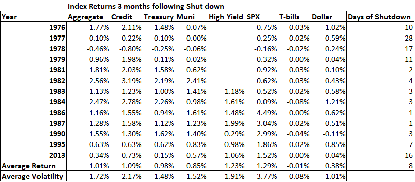 For the all the tensions in Washington D.C. over who’s the blame for the shutdown of the government, investors are going to be quite happy. A shutdown of government sounds negative but is viewed by investors as a wrinkle rather than a big fork in the road. This is seen from bond and stock returns that have been uniformly positive during and after shut downs and debt ceilings negotiations end. U.S. political risk is seen an investment opportunity and there are several reasons why.