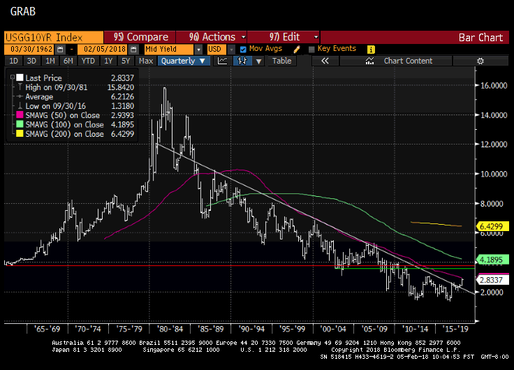The Bond Market. Something has changed materially. We have seen a flattening curve for months. In fact, in 2017 the return on the 30 year bond was nearly double digits. Now, the markets are realizing that the fiscal, regulatory and tax reform are indeed driving growth. The curve is quickly steepening again, and from a much higher short rate baseline. This is frankly just a “normalization”. Keep in mind that this is a reflection of improving economic fundamentals. This is generally good for stocks. But it is a regime change. We are indeed seeing wage pressure that we have not seen in this economic cycle. There are budding signs of inflation in the system. There is also a growing unfunded set of liabilities with more spending to come(infrastructure?)for the bond market to consider. The interest rate framework must account for all of this. It appears that we could see 3.25 to 3.5% 10 year in this cycle. The chart below shows the generic US 10 year going back to 1960. Clearly, we have broken out from the previous, long established downtrend.The green line is 3.42 yield