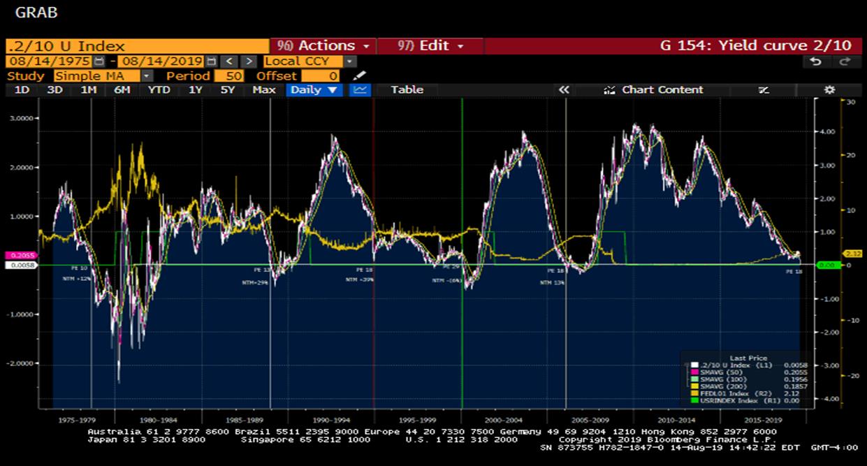 The Graph below is the 2/10 Yield curve since 1975.