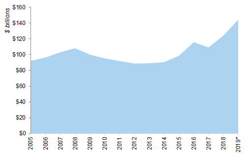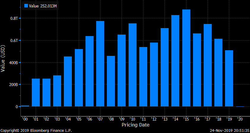 Annual IPO volume (pricings) from 2000 to 2019