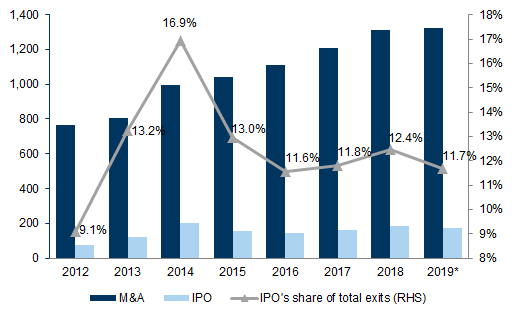 Total number of exits of VC-backed companies by Goldman Sachs & CB Insights