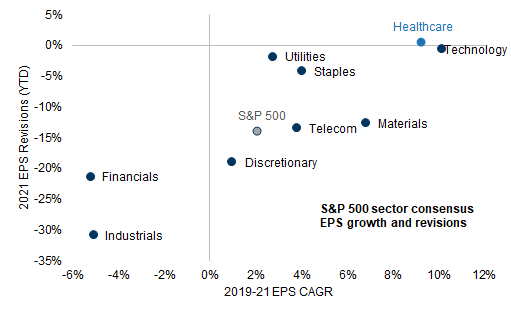 As a sector, a "cyclical recovery" is likely. According to Goldman Sachs "US hospitals will likely end 2020 with inpatient surgeries down about 12% and outpatient surgeries down more than 15%, with the elderly making up the lion’s share of these missing procedures. Our new category-by-category analysis of this potential backlog of risk averse patients suggests a major -- and potentially still under-appreciated -- tailwind to Medtech growth after vaccinations, starting in 2H21 and lasting for two or more years. Specifically, we believe this backlog should be incremental to what would otherwise already be largely normalized procedure volumes by 2022". Additionally, for Diagnostics and Life Science Tools providers, earnings will likely reaccelerate as labs reopen and budgets expand.