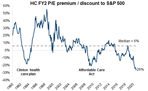 Proposed and enacted regulatory changes have been significant and have already begun implementation. From the Trump Administration plan "Warp Speed", which dramatically accelerated the development of Covid vaccines, to the cutting of FDA red tape reducing drug clearance times, it has been a surprise tailwind. "The result has been greater efficiencies such as earlier proof-of-concept, higher probability of success, and greater effect size upon success. According to BTIG, "These elements have led to a greater number of average new drug approvals per year over the past five years (44.6) than in any five year span since at least 1990". With the prospects of a new Administration just ahead of us, that could indeed flip to a risk. But, it appears that the horse has left the barn with regards to the benefits of a more lenient regulatory approach. Either way, the markets have certainly priced in the years of suppressive regulations in healthcare as evidenced by those most exposed to high regulations trading at the biggest historical discounts.