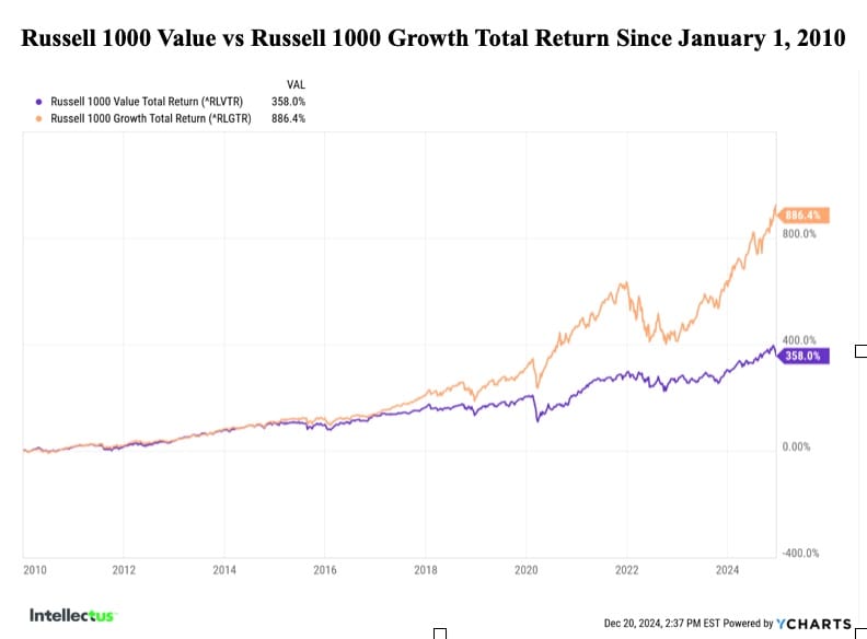 The annual performance (below) of the two major indices — the Russell 1000 Growth Total Return Index and Russell 1000 Value Total Return Index —illustrates their historically cyclical dynamic. However, the noteworthy development we have are highlighting has emerged: the prolonged outperformance of growth stocks in recent years, signaling a potential paradigm shift in market dynamics. Historically, growth and value stocks alternated in dominance over cycles lasting 2–3 years, influenced by economic and market conditions. Yet, the sustained leadership of growth stocks over the past decade raises important questions about structural changes in the economy and evolving investor behavior.