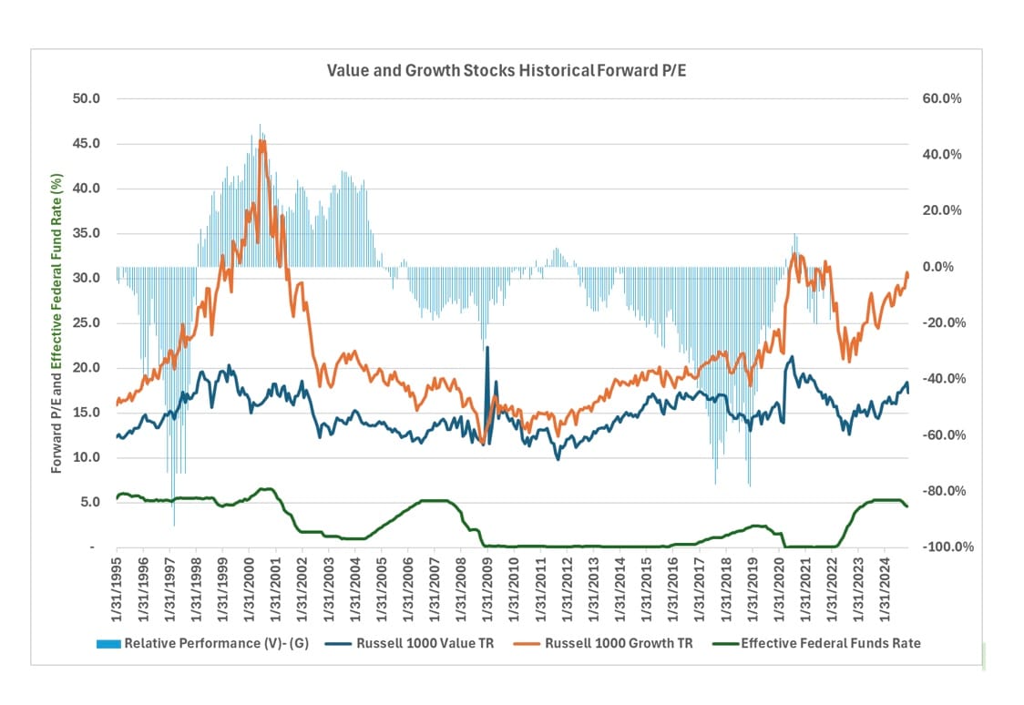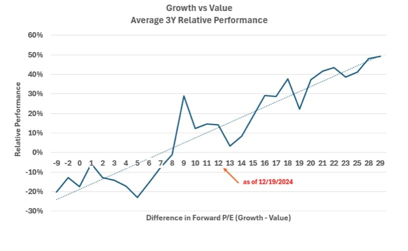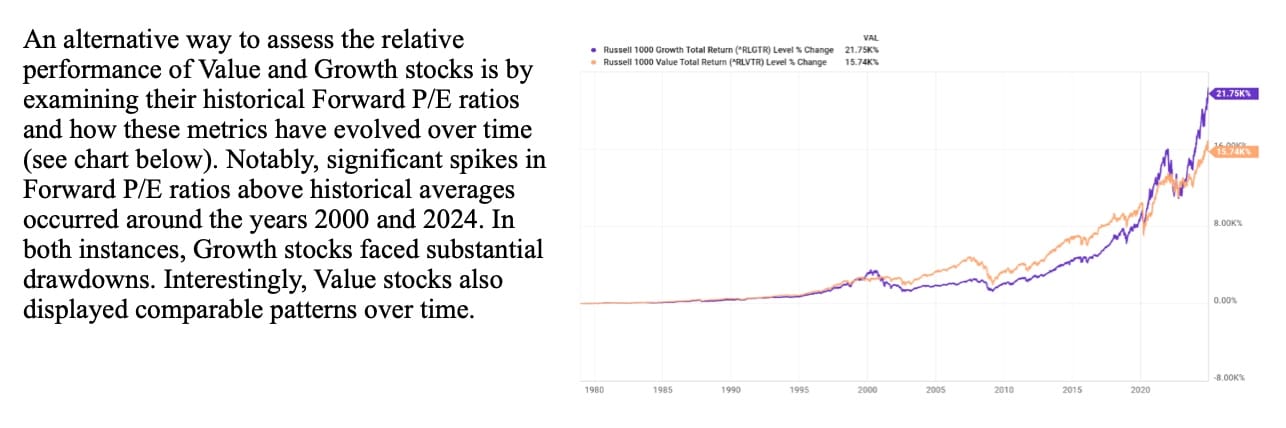 The relative performance of Growth and Value stocks when the Forward P/E spread widens is a key metric. Historically, a wider spread has often signaled a higher likelihood of Value stocks outperforming Growth stocks over the subsequent 2–3 years, and, in some cases, for even longer durations.